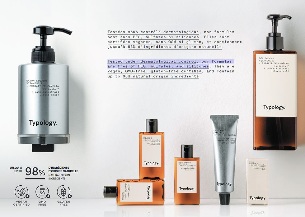 สำหรับตัวเลือกแบรนด์ที่ปราศจาก PEG, Sulfates และ Silicone ที่ผ่าน Dermatological control และ มี Natural ingredient สูงถึง 98% นั้นคือ แบรนด์ Typology Paris